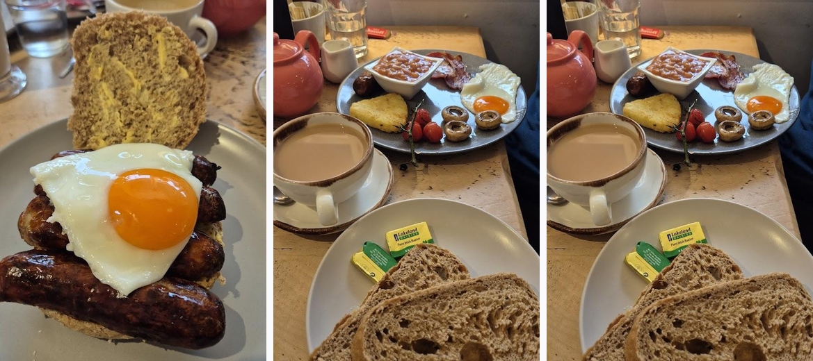 We found this cafe by fluke when driving by, it was 11:45 and the pub round the corner was shut, we noticed the sign on side of the road and drove in (lots of free parking) Staff were very polite and friendly and the cafe was very clean and tidy. Sausage score is 10/10 !! I do not give a 10/10 lightly however this was perfection. I would definitely come back to here again. Total price paid for Big Breakfast and regular breakfast along with Latte and hot chocolate was £28.80 WiFi is also available here as well. Bluelight card is not accepted if anyone was wondering.